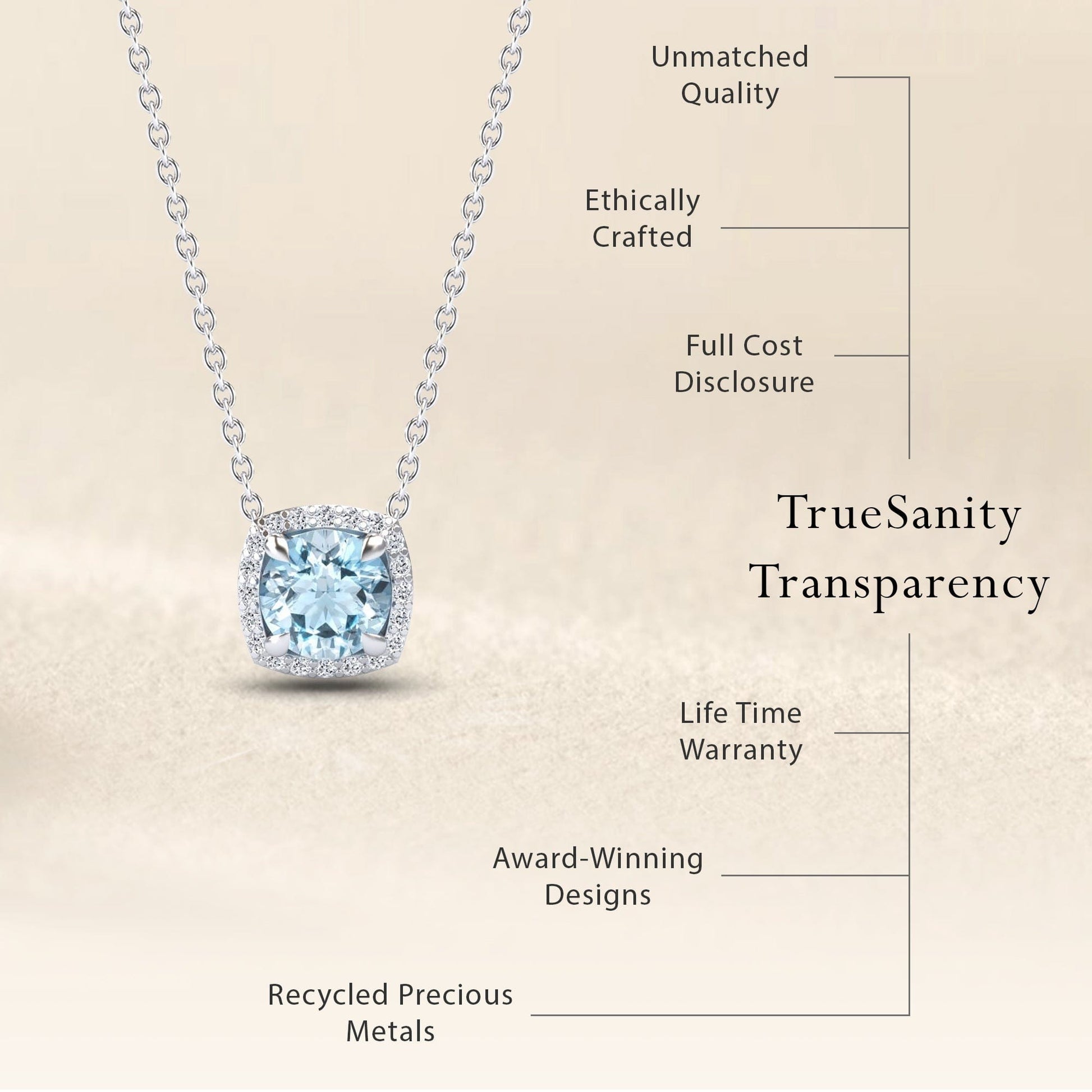 Dive into the serene beauty of the Eileen Necklace, featuring a captivating aquamarine gemstone embraced by a halo of glistening white diamonds. This elegant aquamarine and diamond pendant, available in luminous white gold, romantic rose gold, warm yellow gold, or striking black gold, adds a touch of understated glamour to any look.