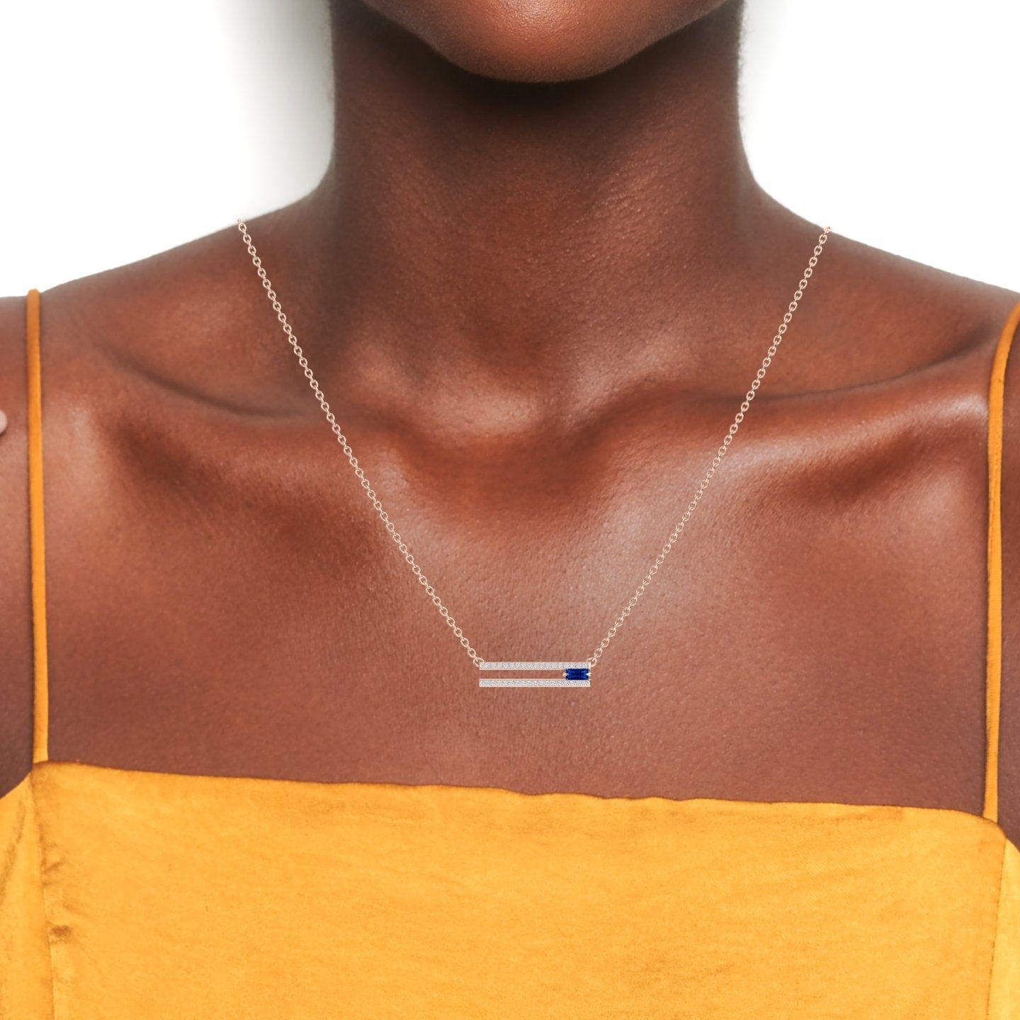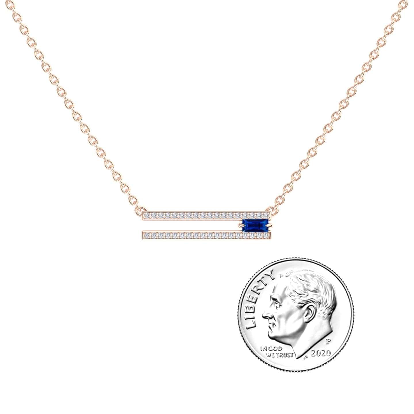 Elevate your style with our Blue Sapphire & Diamond Bar Necklace - Beatriz, showcasing a stunning baguette-cut blue sapphire accented by brilliant round diamonds in a sleek bar design. Available in white gold, rose gold, yellow gold, or blackened gold, this sophisticated piece is perfect for both everyday elegance and special occasions.
