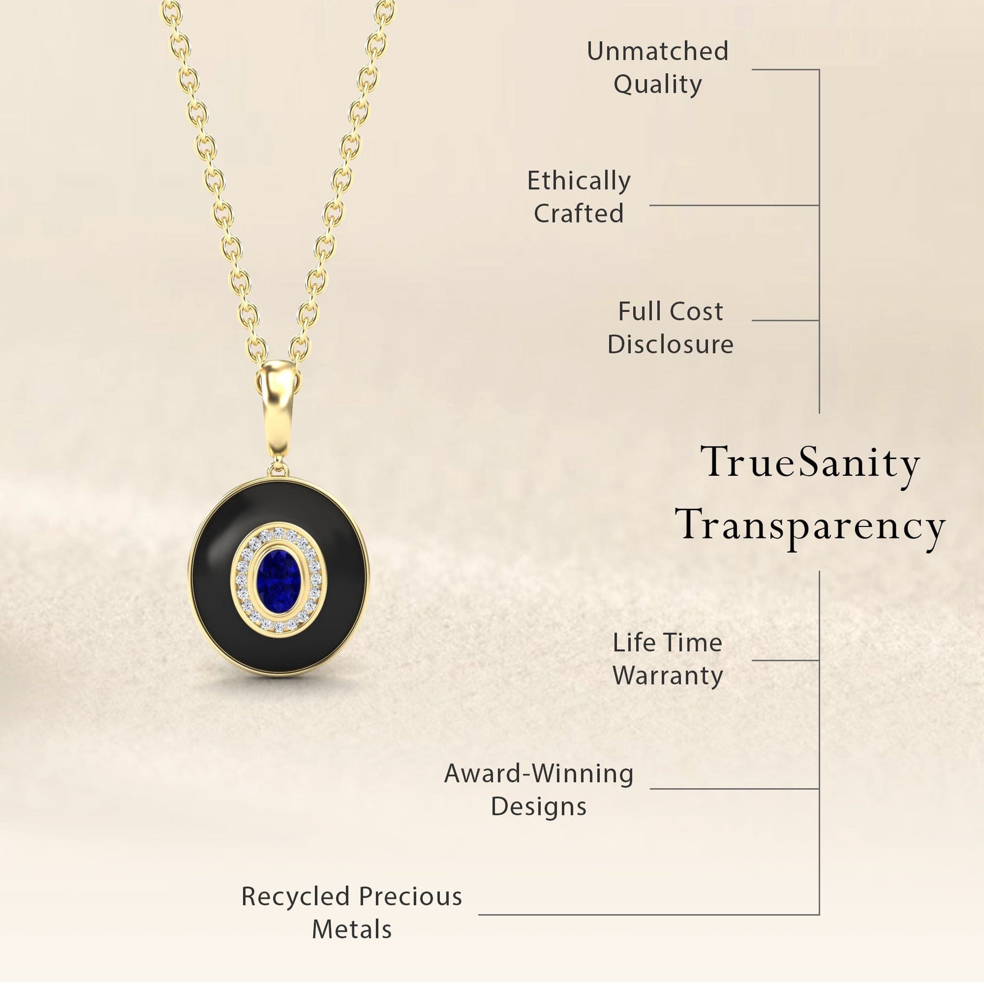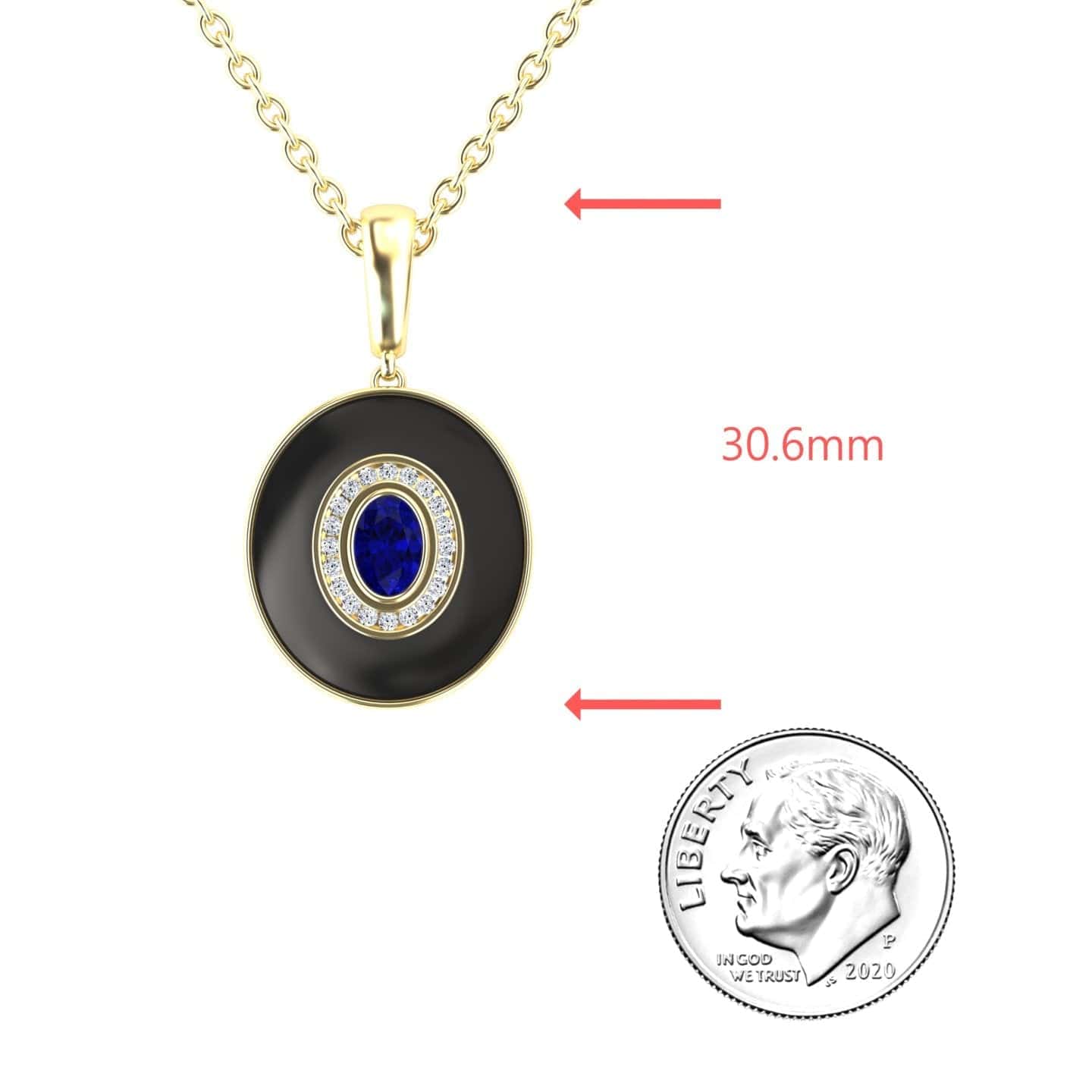 The Blue Sapphire & Diamond Black Enamel Halo Necklace - Edith is a stunning fusion of elegance and modern design. Featuring a rich oval-cut blue sapphire encased in a sleek black enamel halo with sparkling round diamonds, this necklace makes a bold yet timeless statement. Available in White Gold, Rose Gold, Yellow Gold, and Blackened Gold, itโs perfect for those who love sophisticated gemstone jewelry.