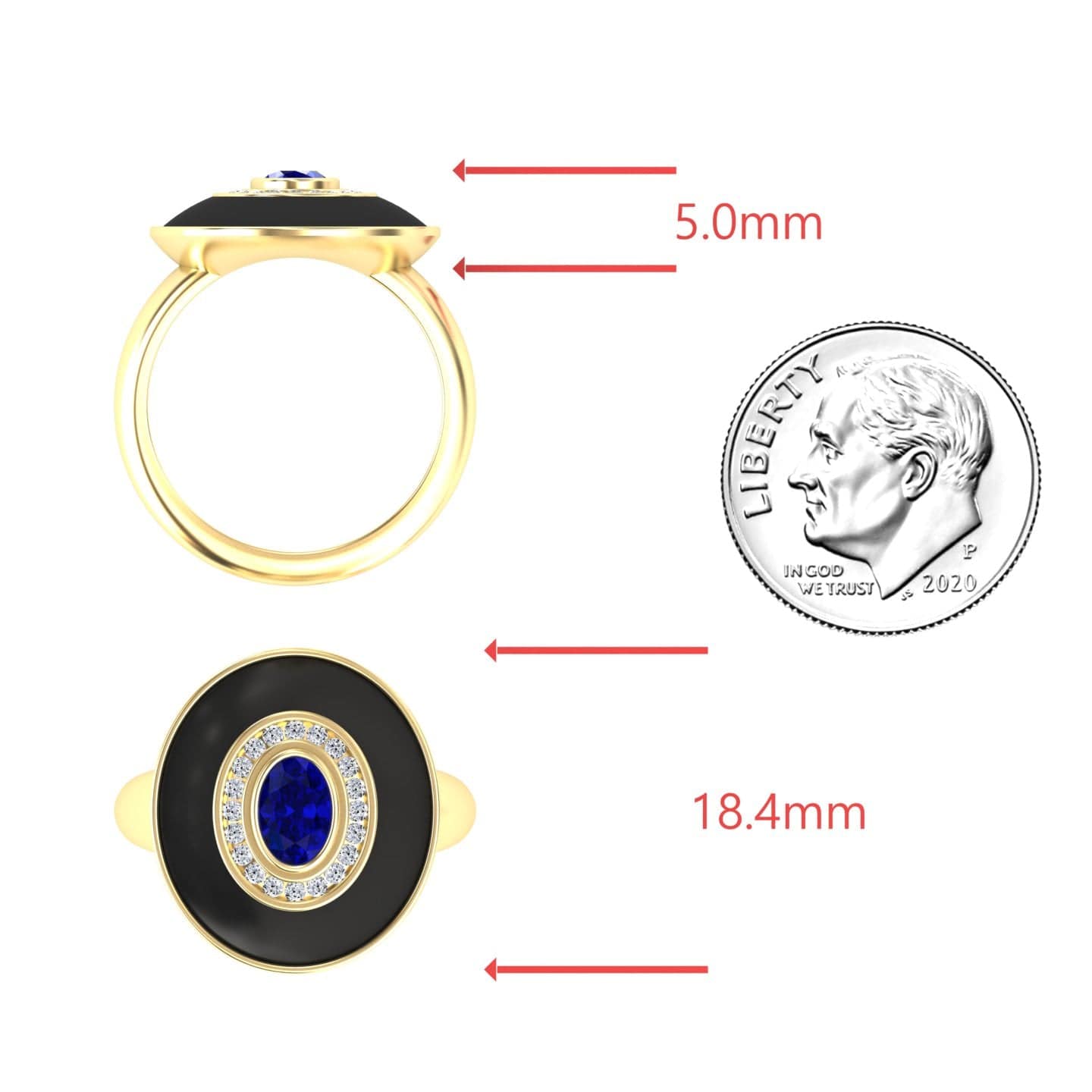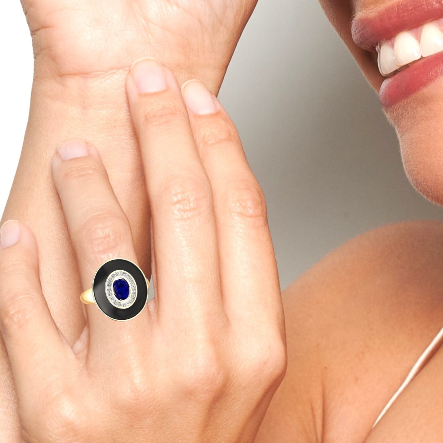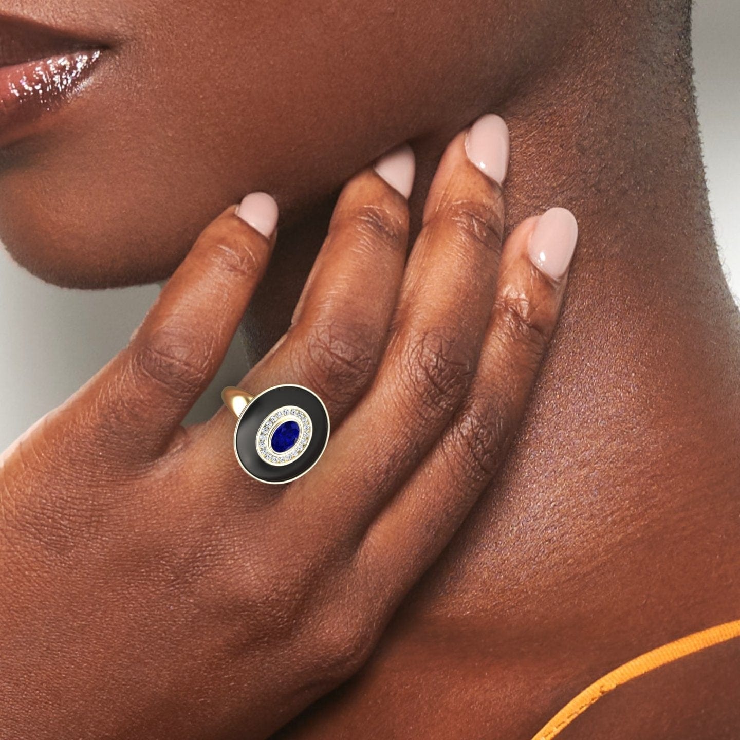 Make a bold statement with the Camille Blue Sapphire & Diamond Black Enamel Halo Ring. Featuring an exquisite oval-cut blue sapphire at its center, encircled by a sparkling round diamond halo, this Art Deco-inspired ring is accentuated with a sleek black enamel finish. Available in White Gold, Rose Gold, Yellow Gold, and Blackened Gold, this elegant piece is perfect for those who love vintage charm with a modern edge.