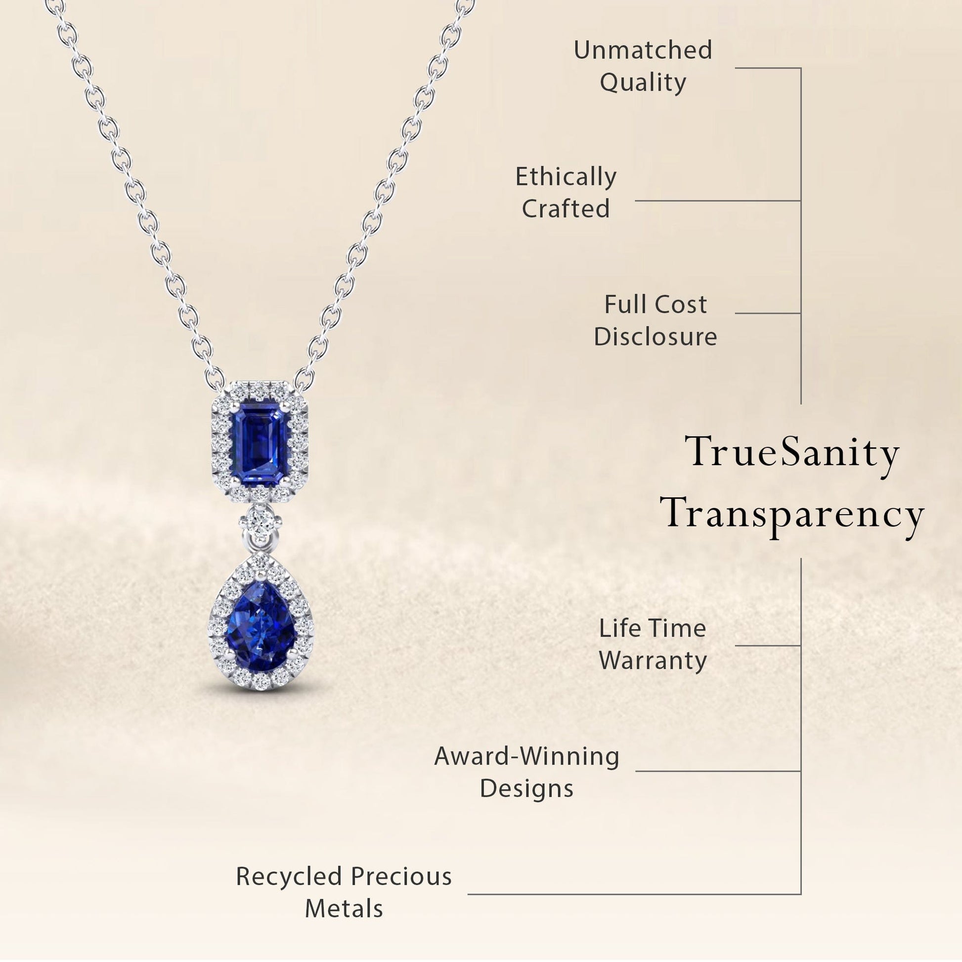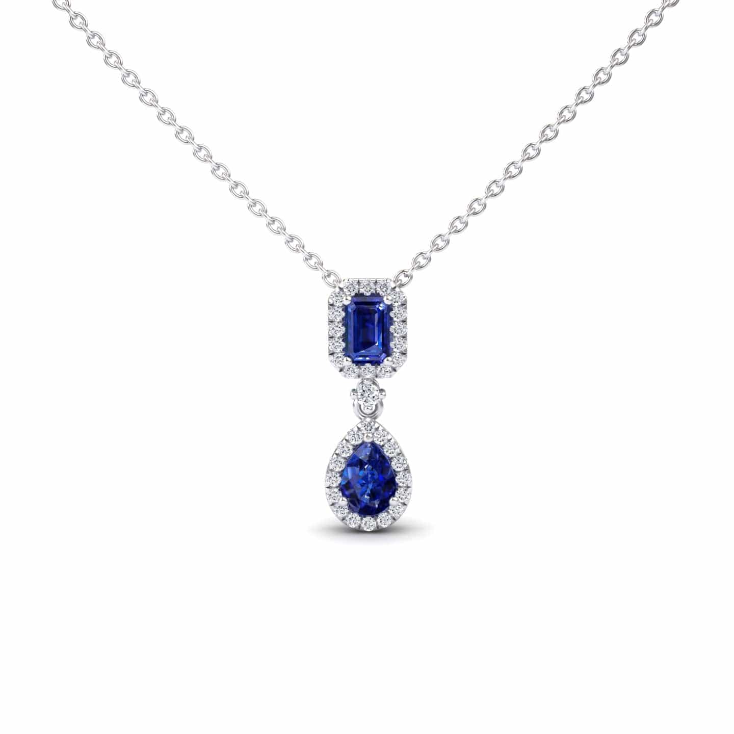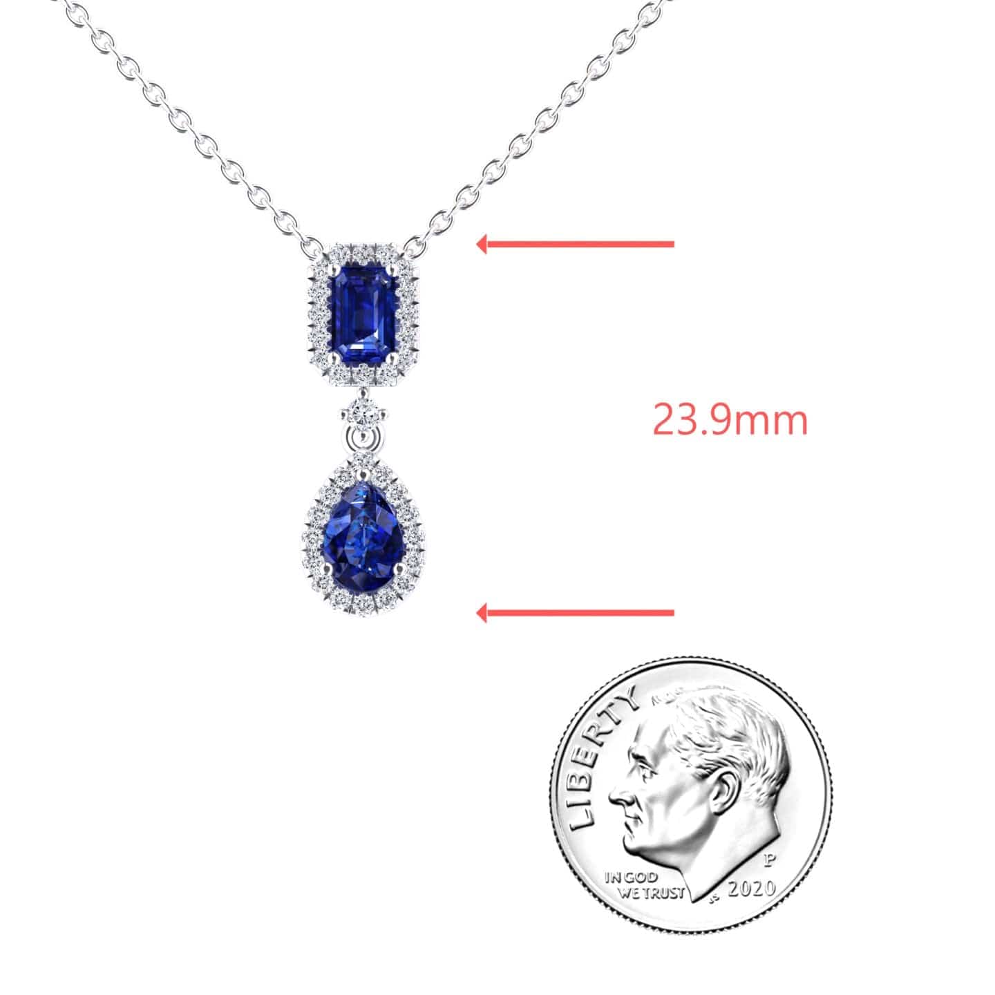 Elevate your elegance with the Blue Sapphire & Diamond Double Halo Drop Necklace - Sarai. Featuring a captivating pear-cut and emerald-cut blue sapphire, encased in shimmering diamond halos, this masterpiece exudes sophistication. Available in White Gold, Rose Gold, Yellow Gold, and Blackened Gold, itโs a timeless addition to any fine jewelry collection.