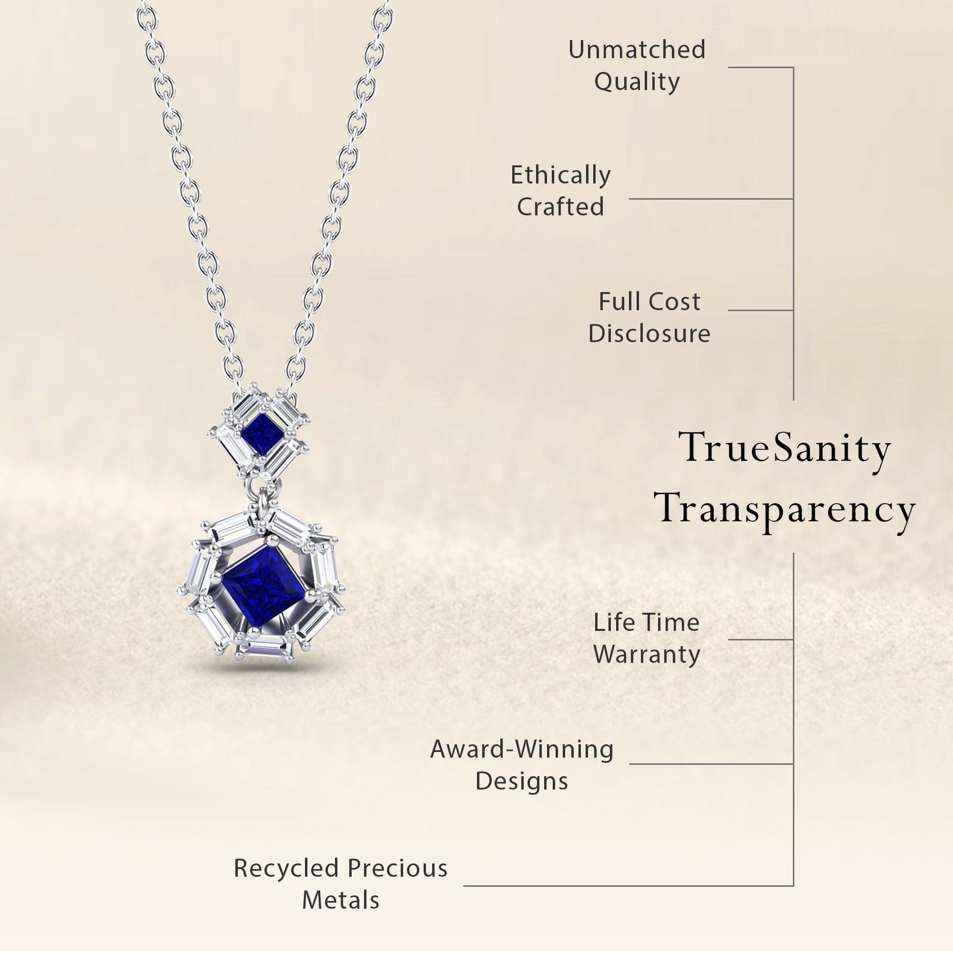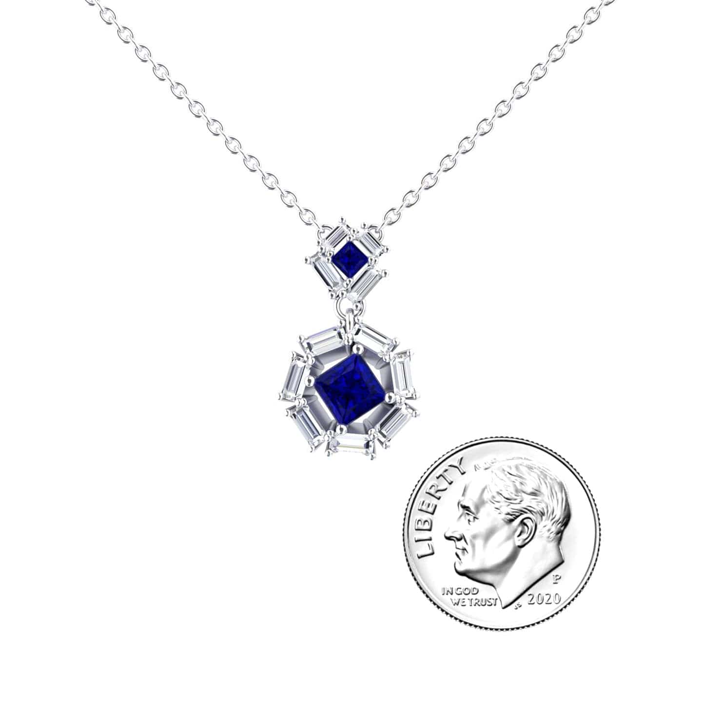 The Blue Sapphire & Diamond Geometric Halo Necklace - Reema is a breathtaking statement piece featuring a princess-cut blue sapphire, elegantly surrounded by brilliant baguette-cut diamonds in a modern geometric halo. Crafted in your choice of White Gold, Rose Gold, Yellow Gold, or Blackened Gold, this necklace is a timeless expression of sophistication and luxury.