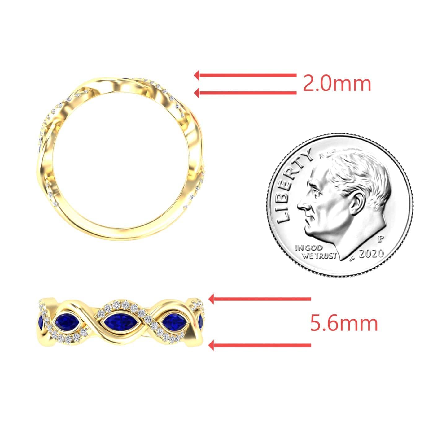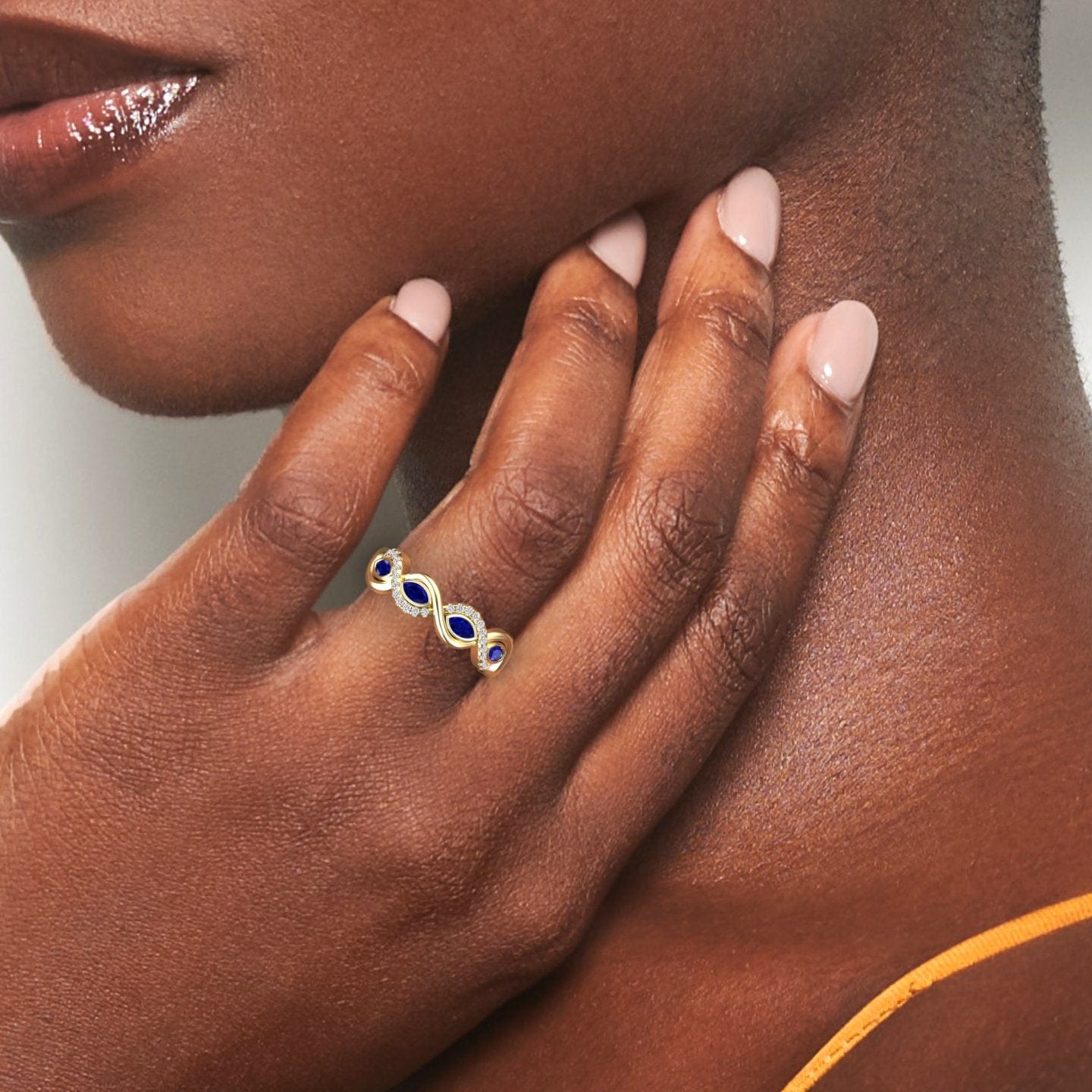 Elegance meets brilliance in the Blue Sapphire & Diamond Infinity Twist Band - Selma, featuring five marquise-cut deep blue sapphires gracefully entwined with shimmering round diamonds. Designed to symbolize eternity and sophistication, this exquisite band is available in White Gold, Rose Gold, Yellow Gold, and Blackened Gold, perfect for stacking or as a statement piece.