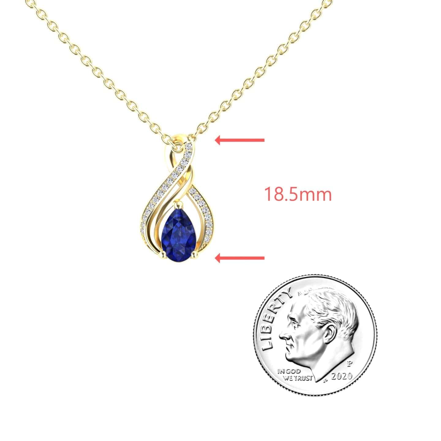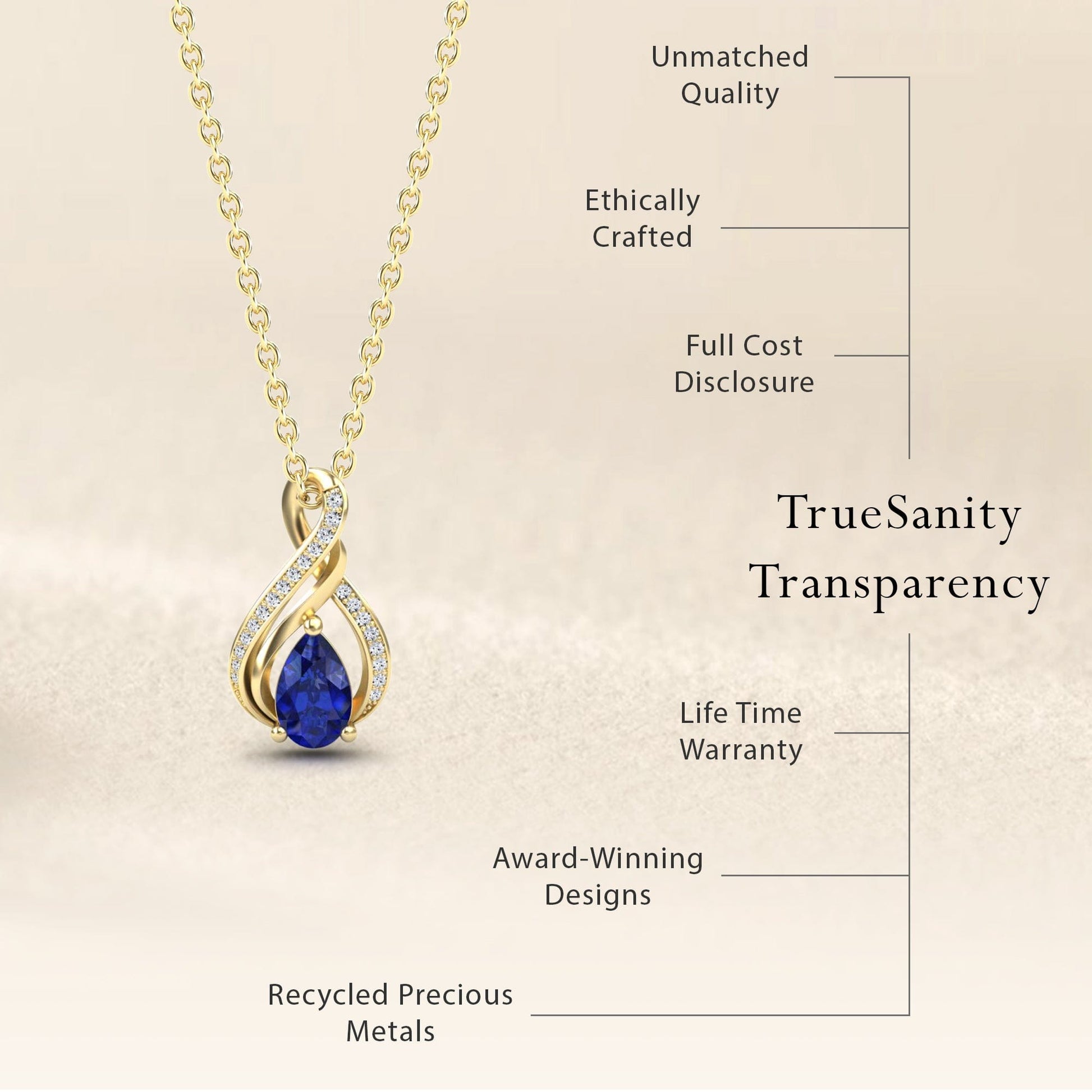 The Blue Sapphire & Diamond Infinity Twist Necklace - Maddison is a timeless symbol of elegance and devotion. Featuring a rich pear-shaped blue sapphire embraced by a diamond-accented infinity twist, this piece radiates sophistication and charm. Available in White Gold, Rose Gold, Yellow Gold, and Blackened Gold, it's a stunning addition to any fine jewelry collection.