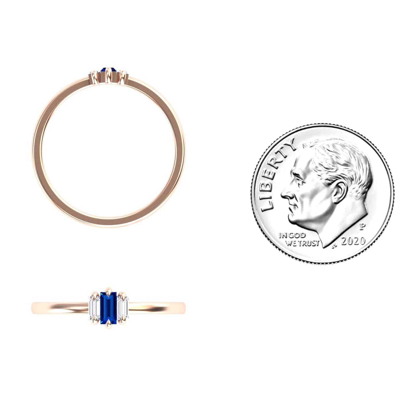 The Blue Sapphire & Diamond Three-Stone Ring - Marina features a stunning baguette-cut blue sapphire center stone, elegantly complemented by two dazzling white baguette diamonds. A refined yet modern statement piece, available in White Gold, Rose Gold, Yellow Gold, and Blackened Gold, perfect for those who love timeless elegance with a contemporary twist.