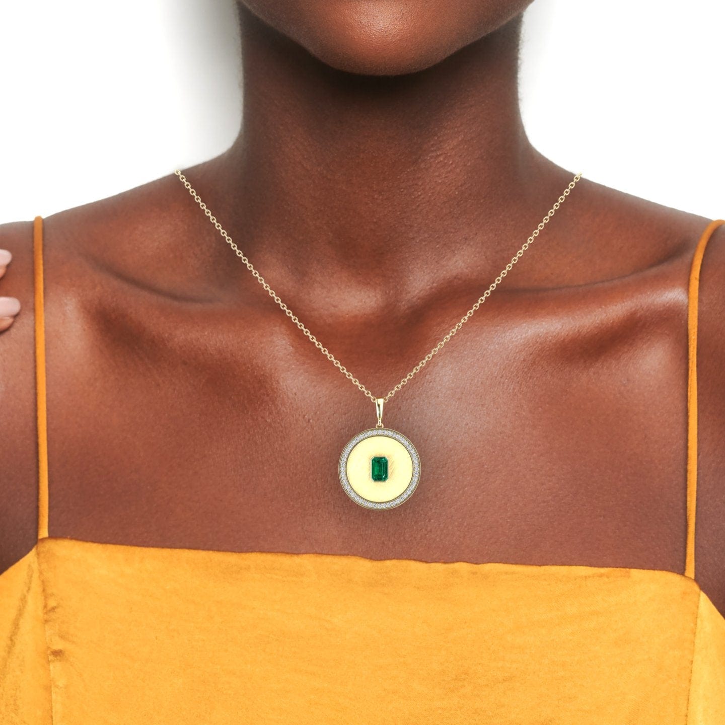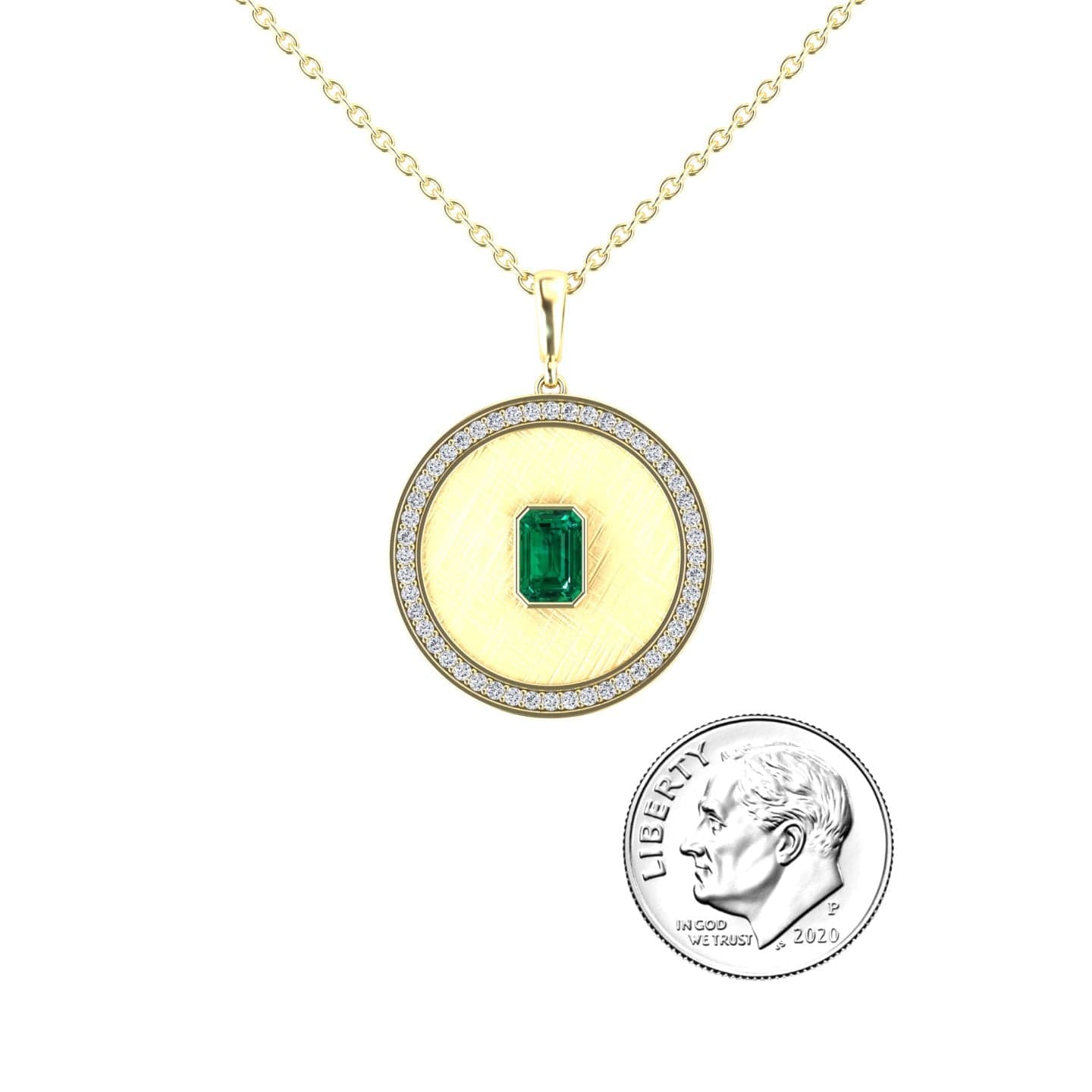 Make a bold statement with the Emerald & Diamond Textured Medallion Necklace - Jasmine, showcasing a mesmerizing emerald-cut emerald at its center, framed by a sparkling diamond halo. The brushed gold medallion enhances its vintage charm, offering a sophisticated yet modern appeal. Available in White Gold, Rose Gold, Yellow Gold, and Blackened Gold.