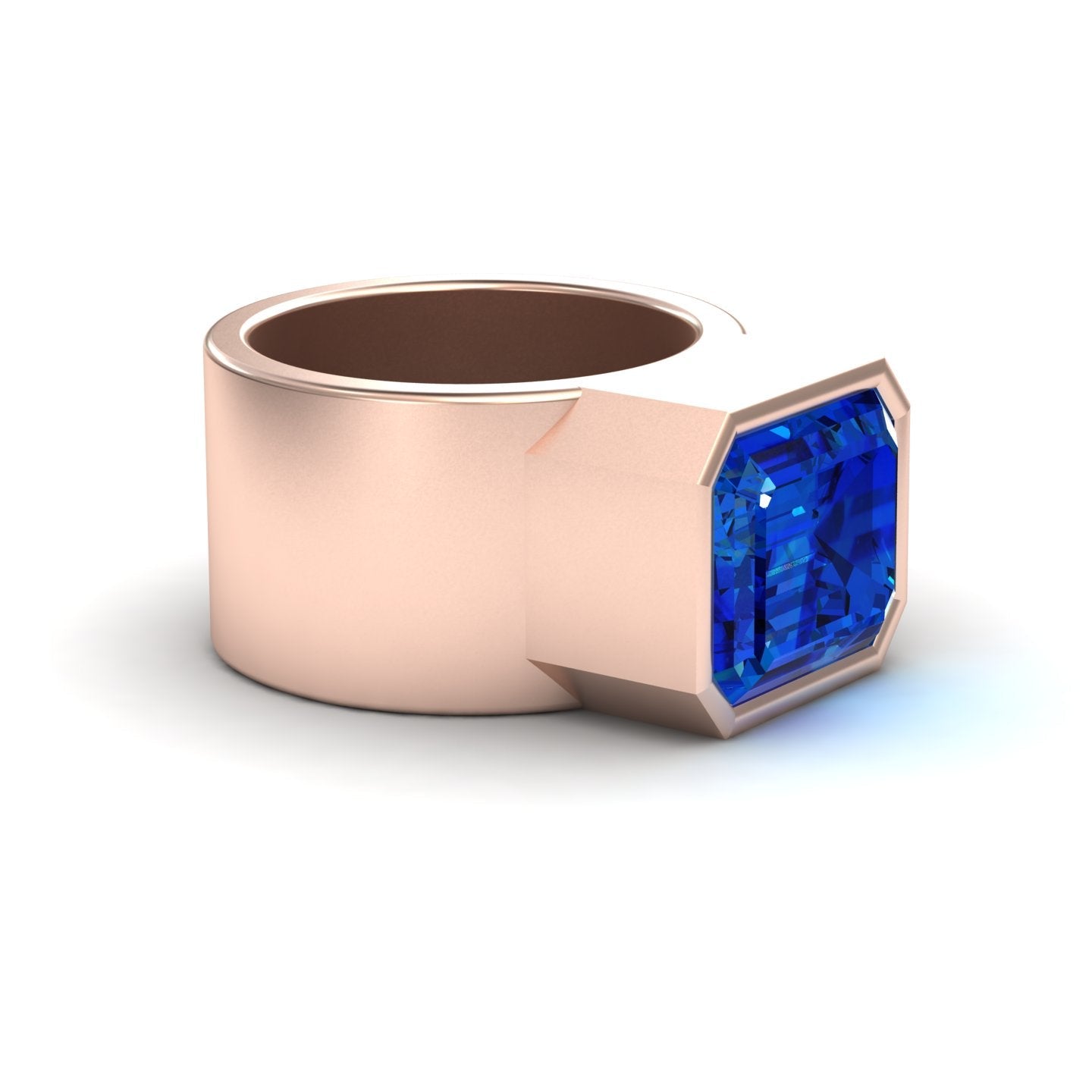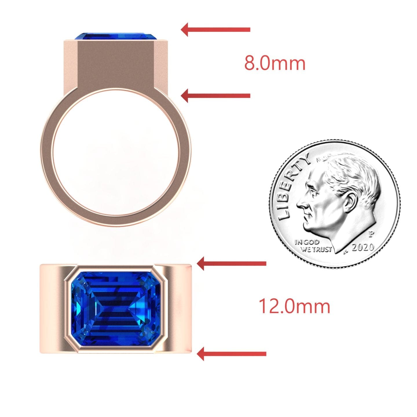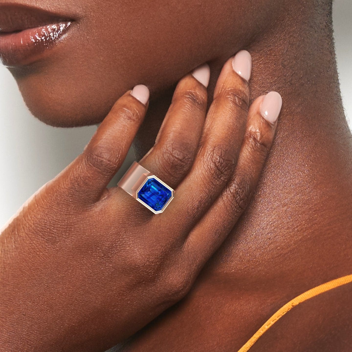 The Lab Grown Blue Sapphire Statement Ring - Aparna showcases a stunning emerald-cut blue sapphire that radiates elegance and brilliance. Set in your choice of white gold, rose gold, yellow gold, or blackened gold, this statement ring is perfect for those who appreciate bold, sophisticated, and ethically crafted gemstone jewelry.