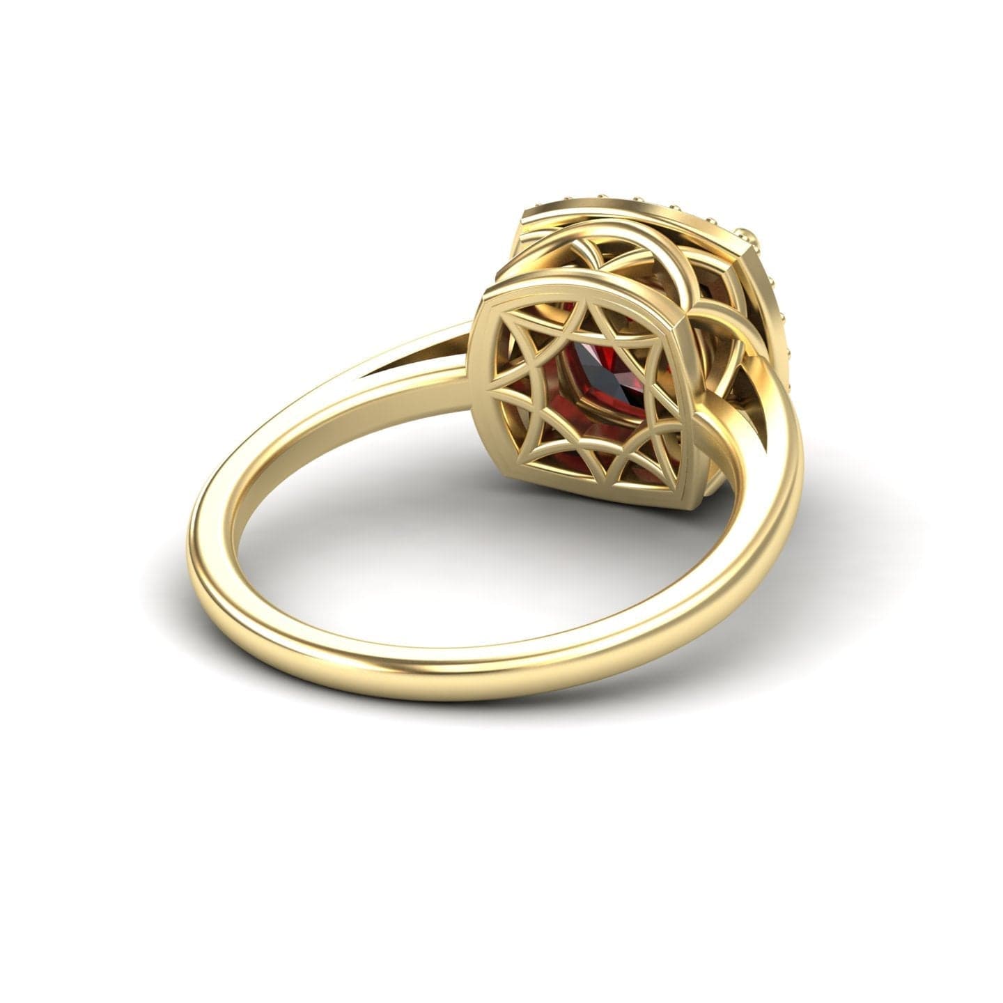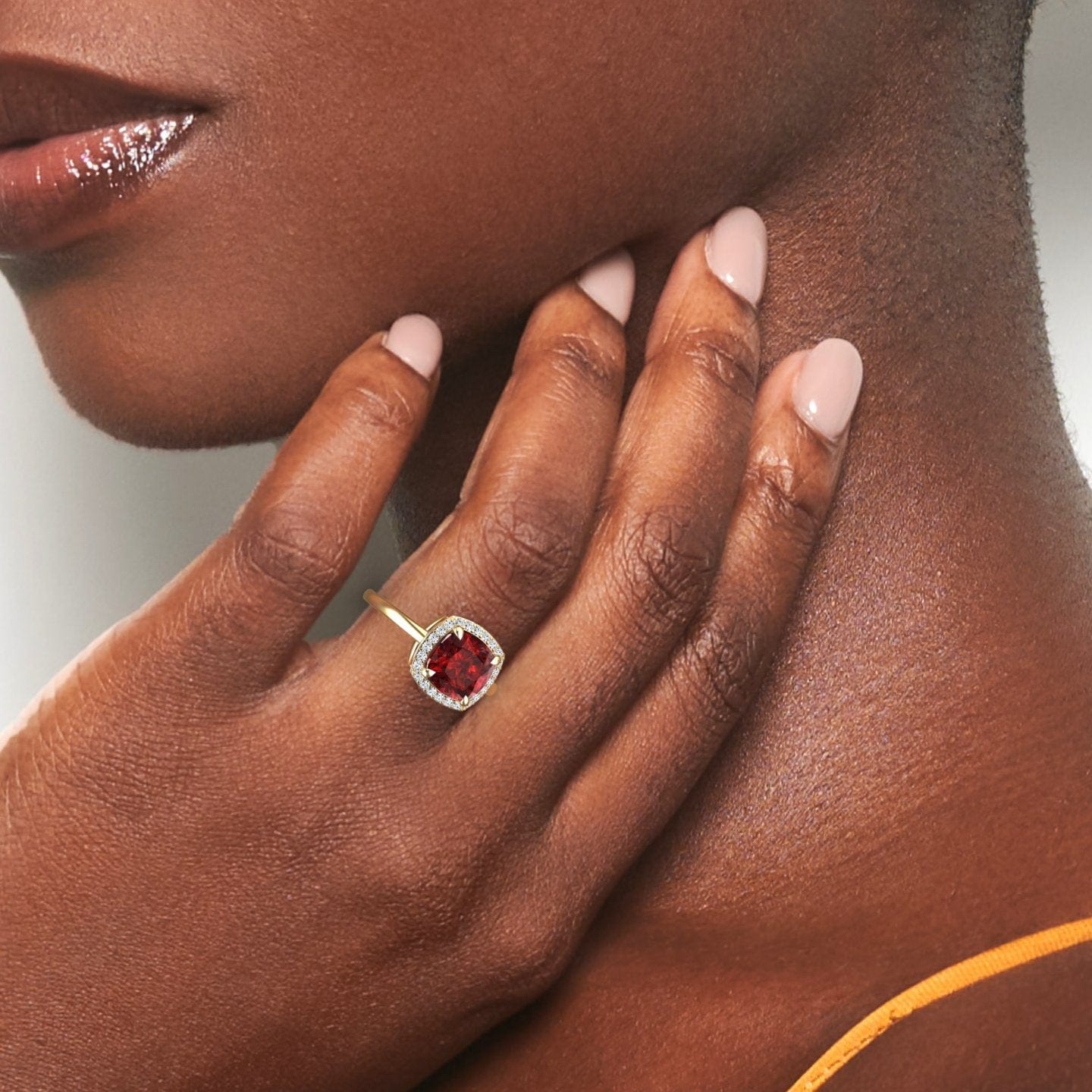 The Lab Grown Ruby & Diamond Halo Ring - Ziva is a radiant symbol of love and luxury, featuring a vibrant lab-grown ruby surrounded by a sparkling halo of diamonds. Available in four stunning gold colors—white gold, rose gold, yellow gold, and blackened gold—this exquisite ring combines ethical craftsmanship with timeless beauty, making it the perfect choice for engagements or special occasions.