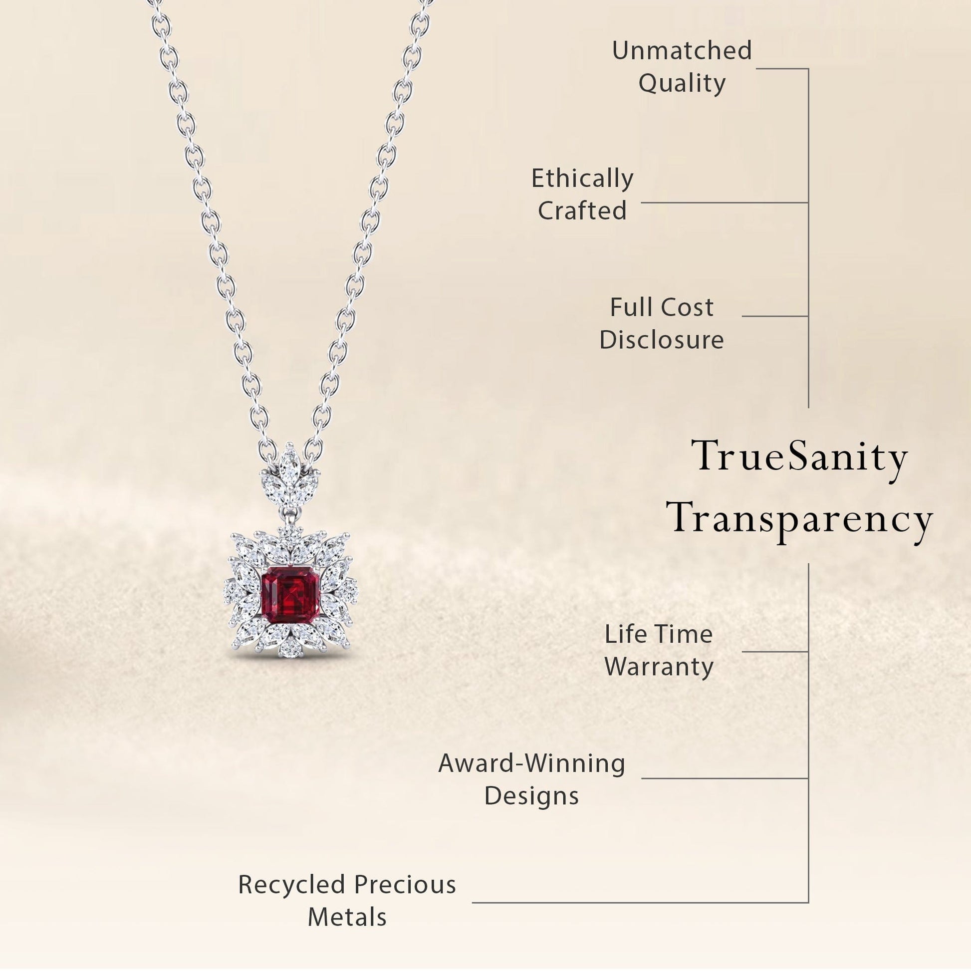 Showcasing a 0.50 ct emerald-cut lab grown ruby at its heart, the Zeina pendant is encircled by a brilliant diamond halo for timeless sophistication. Crafted in your choice of 14K white, rose, yellow, or blackened gold, this elegant ruby necklace is a symbol of passion, power, and sustainable luxury.