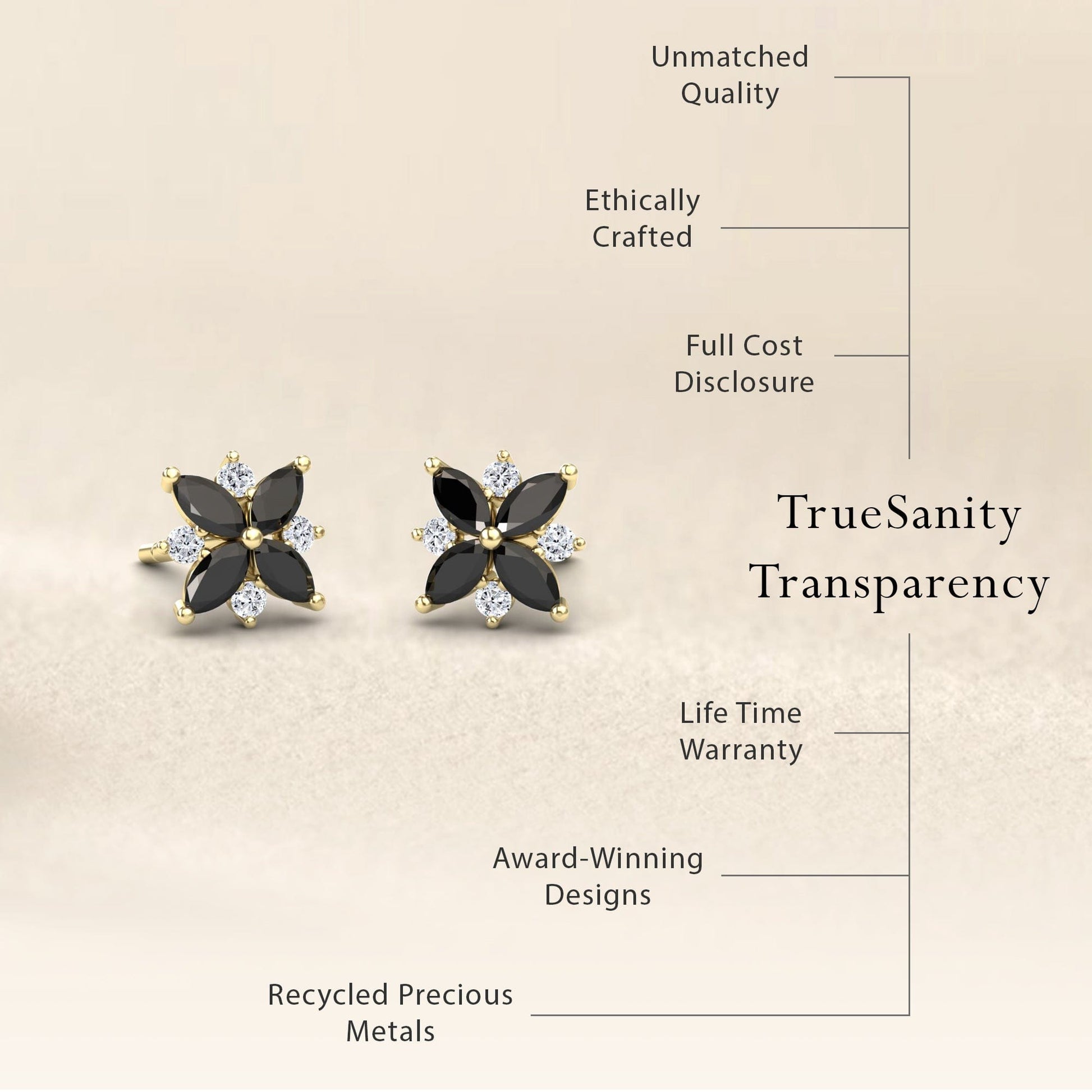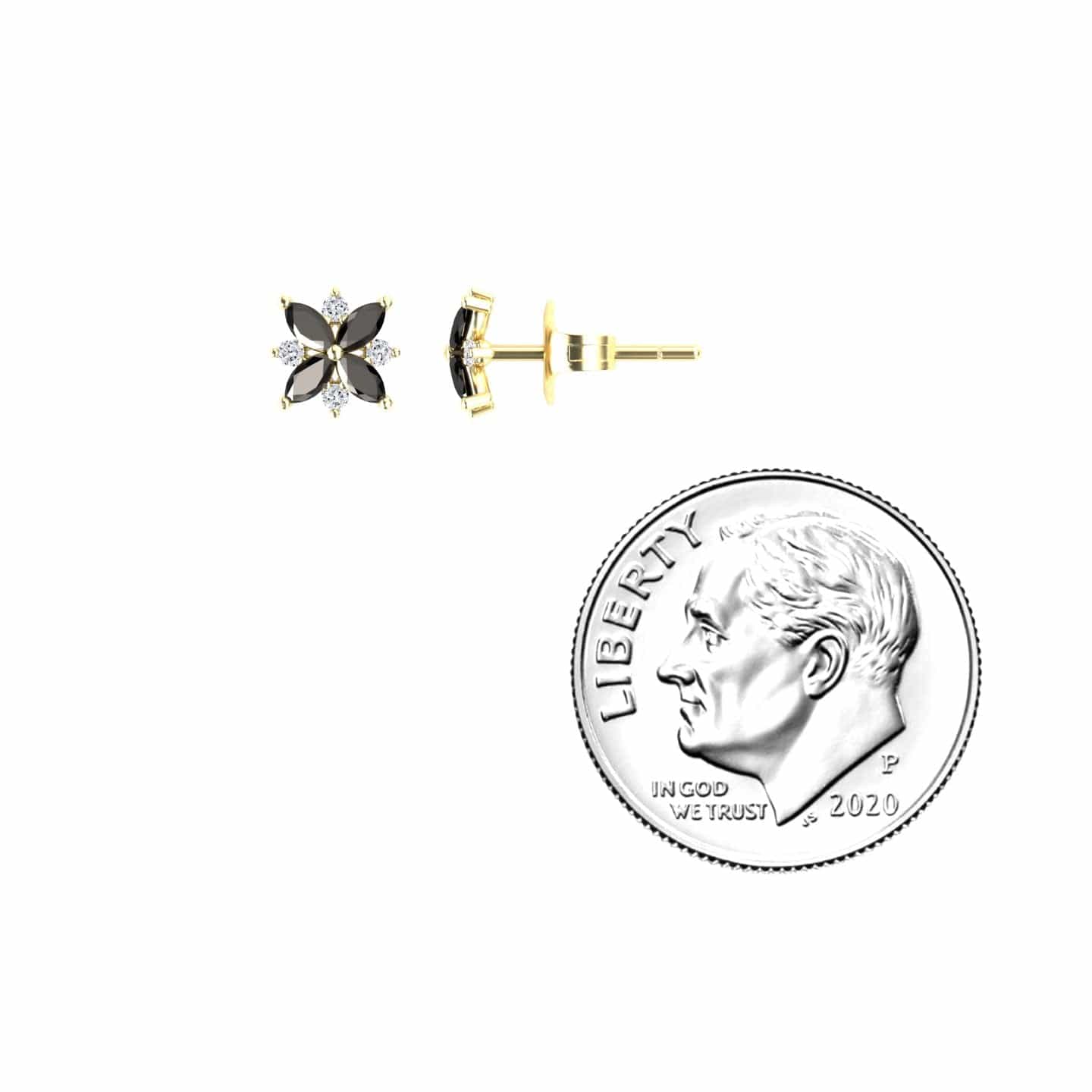 Striking and elegant, the Black & White Diamond Floral Stud Earrings – Madhavi feature a dramatic contrast of rich black diamonds and sparkling white diamonds arranged in a delicate floral silhouette. Crafted in your choice of 14K White Gold, Rose Gold, Yellow Gold, or Blackened Gold, these timeless studs make a bold yet graceful statement.